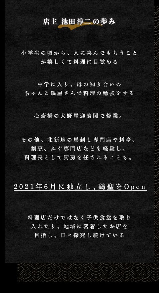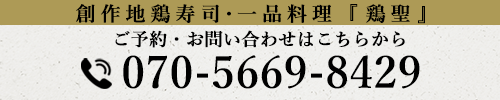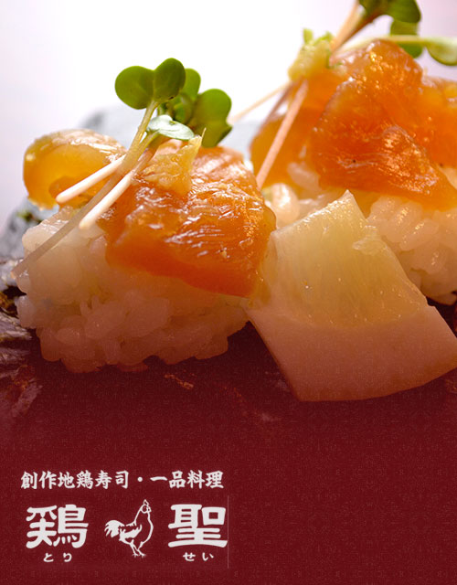 当店は、鶏料理、鶏寿司、野菜寿司が人気の創作居酒屋です。料理はひとつひとつ手作りでお作りしておりますので、事前にご相談いただけましたらお客様のお好みに応じた調理も可能です 当店は、鶏料理、鶏寿司、野菜寿司が人気の創作居酒屋です。料理はひとつひとつ手作りでお作りしておりますので、事前にご相談いただけましたらお客様のお好みに応じた調理も可能です。 創作地鶏寿司・一品料理 鶏聖 〒533-0013大阪市東淀川区豊里2丁目17-21 070-5669-8429 営業時間 《昼》月/木/土 11:00〜15:00 《夜》18:00〜0:00 ※月曜日のみ休み 定休日 第3月曜日・火曜日 ギャラリー